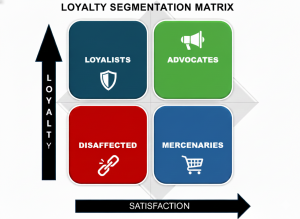 If you plot those customers on a 2×2 matrix with satisfaction and loyalty as the axes, you will find most of them clustered in the upper right quadrant: highly satisfied and highly loyal. And then if you profile their behaviour, you are likely to discover they are also your most valuable customers, the ones spending 3-5 times more than average, who have been around the longest, who are early adopters of new products, who don’t mind paying a premium, who rarely complain, who are the first to provide constructive feedback, who account for a disproportionate share of sales. Go further and profile them according to their interactions and they are also likely to be your most enthusiastic fans with the highest rates of community engagement.