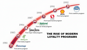 Fast forward to 1981 when American Airlines launched its AAdvantage frequent flyer program offering free flights and upgrades based on the number of miles flown. At the time airline deregulation had spawned many new regional and discount carriers offering low fares, making air travel more affordable for the average person. Unwilling to engage in a race-to-the-bottom fare war with this insurgent flock of carriers, American Airlines scanned its SABRE reservation system for its most frequent flyers and in an effort to insulate them from competitive poaching sent them an invitation to join the program. The response was so overwhelming that it triggered a wave of copycat programs amongst the other airlines, including Air Canada’s Aeroplan in 1984. Seeing the airline programs take off amongst the highly coveted “road warriors”, hotels were quick to adopt the frequency model, beginning with Holiday Inn’s Priority Club in 1983. Car rental agencies followed soon after and then, as retail POS systems began to modernize, retailers started card-based programs of their own, beginning with Neiman Marcus in 1984 and Nordstrom in 1987.